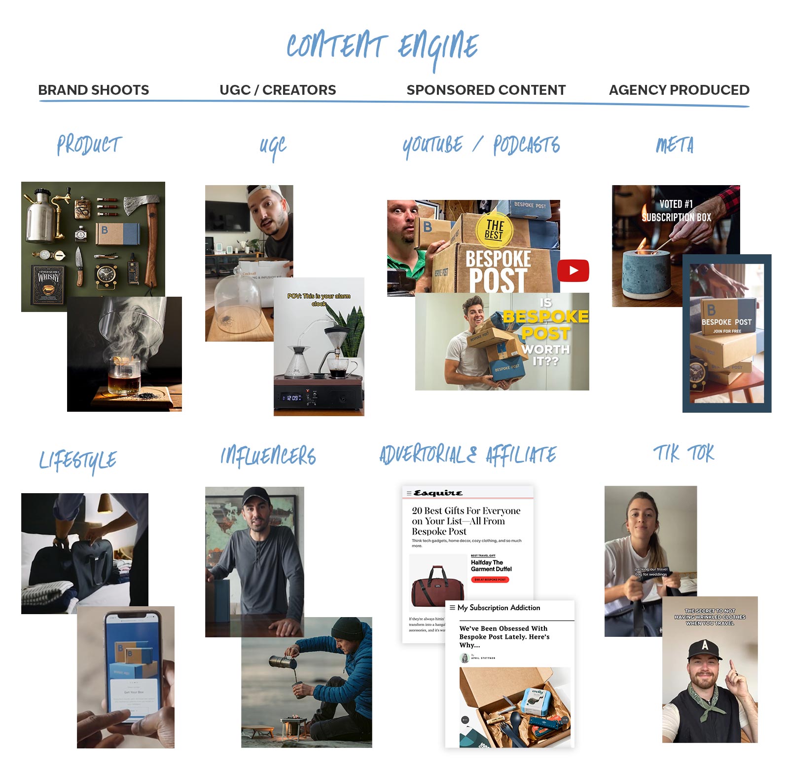 As Creative Director at Bespoke Post, I led a multidisciplinary in-house team and partnered with outside agencies to produce all creative across e-comm, brand and performance marketing. I worked closely with growth and analytics teams to A/B test creative, scale production, and support aggressive spend goals — all while refining our positioning and target customer.