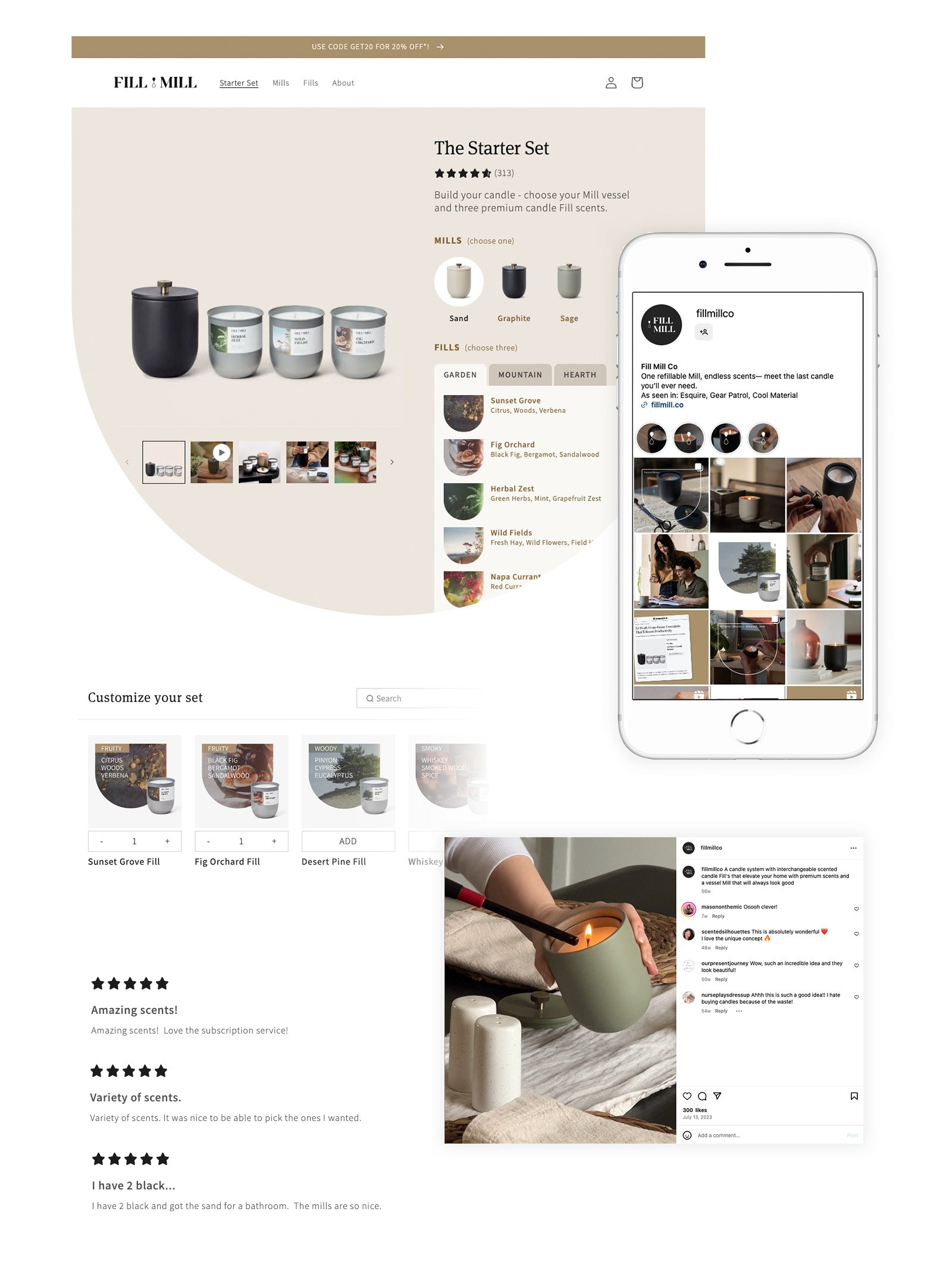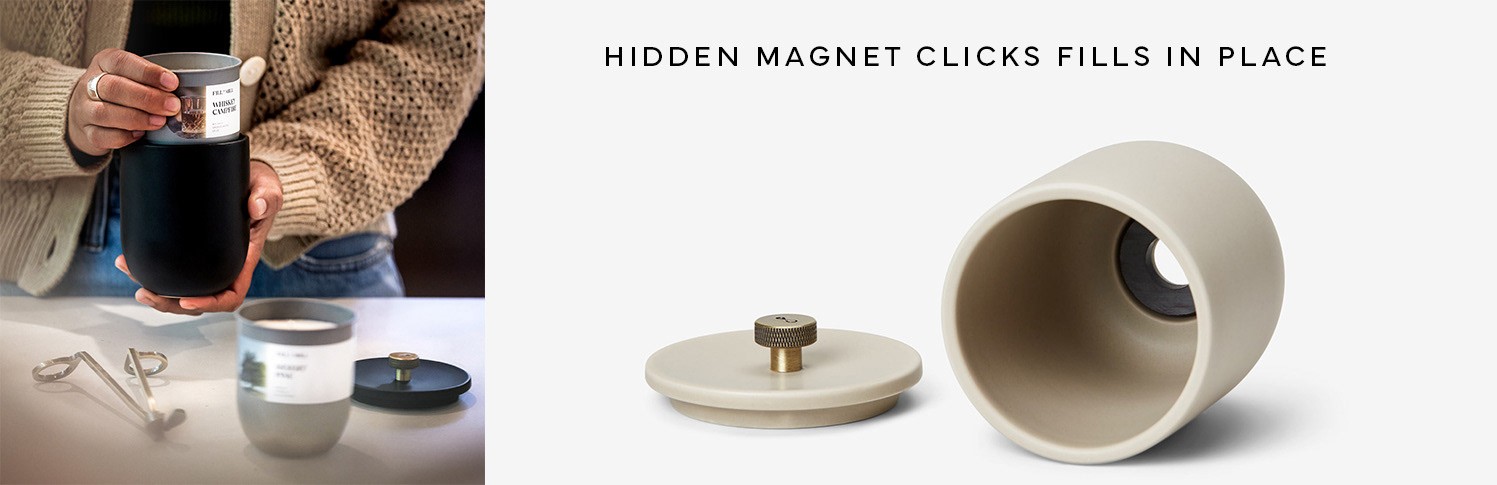 I led creative direction on product design and packaging, using insights from early customer interviews. Our "Mills" feature a patented magnetic locking system, which we featured prominently as a design differentiator. We leaned into sophisticated neutral colors and finishes so they look great as decor pieces even when not in use.