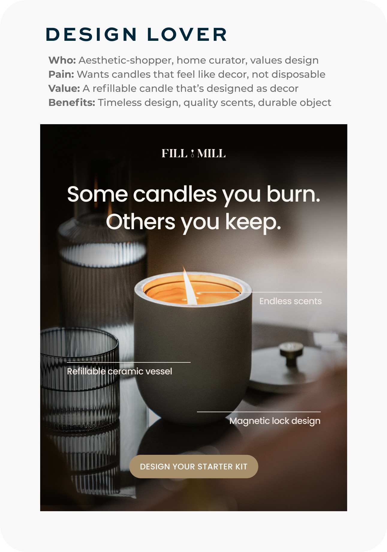 I helped build a candle subscription brand from the ground up—tackling everything from customer and market research, brand positioning and identity, to product design, custom scent development, and launching the brand with a Shopify site, paid and organic social.