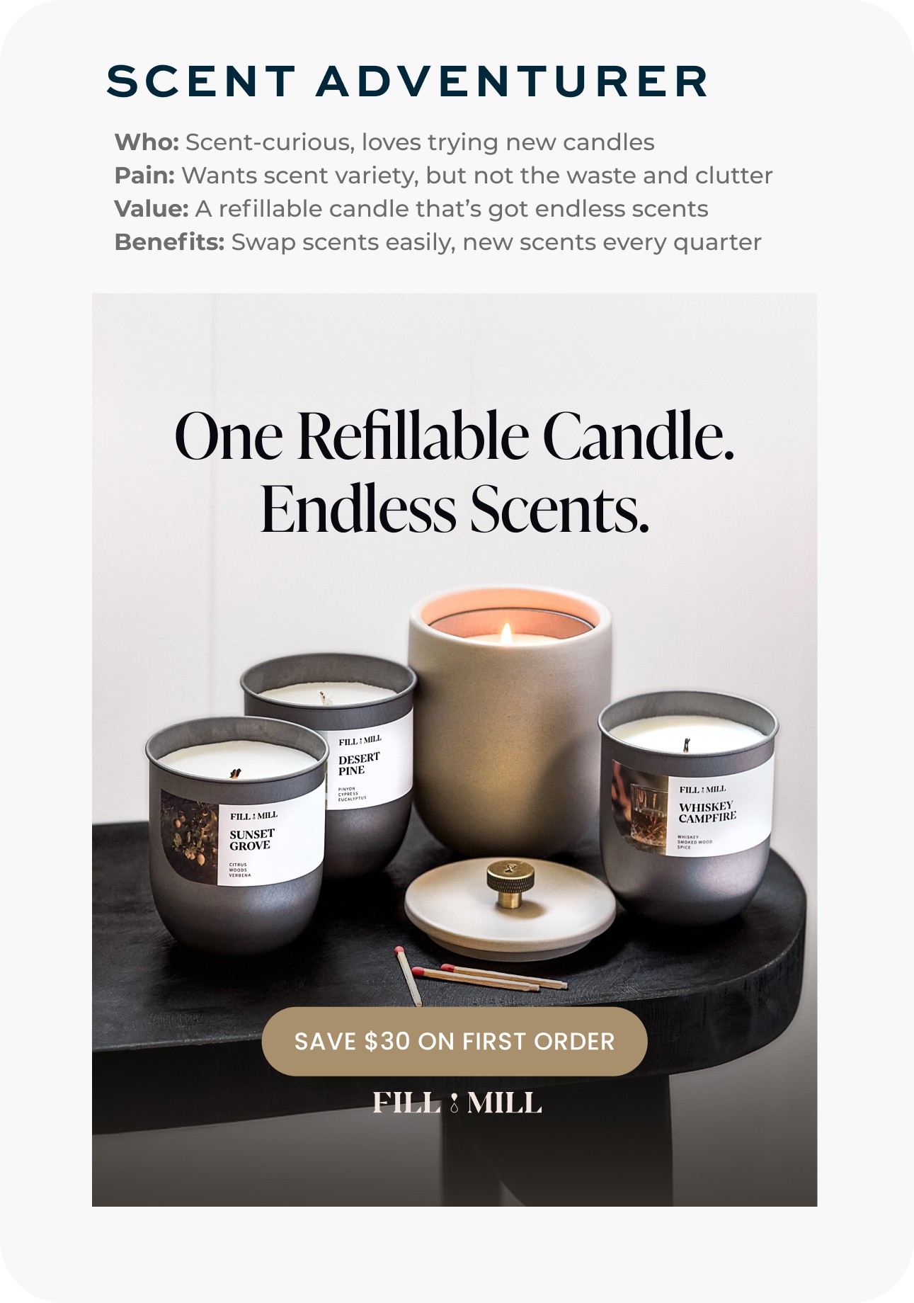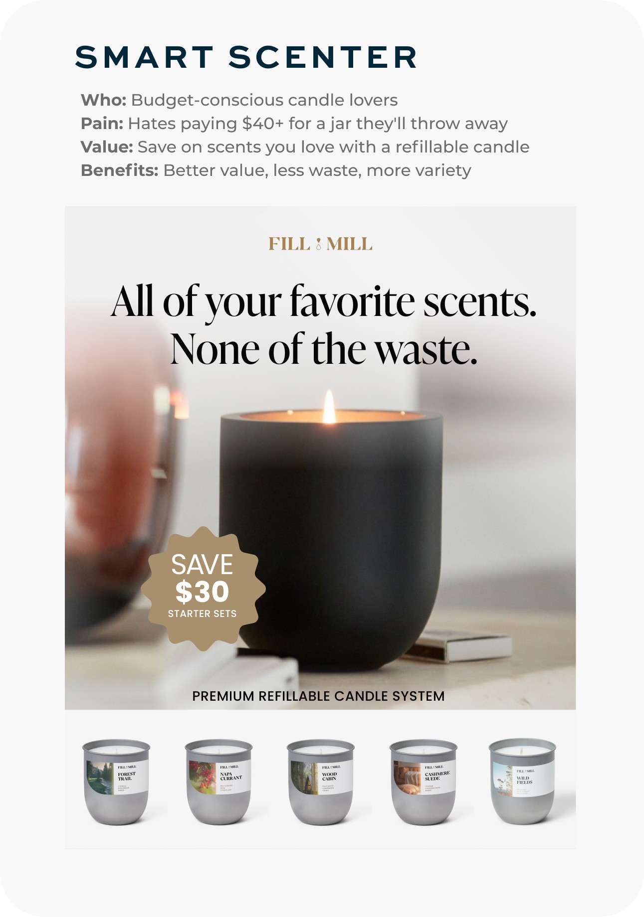 I worked with a leading fragrance developer to design 15 premium scents, using data from customer interviews, competitive analysis, and early reviews on our starter set. I crafted the naming and messaging for all our scents, each telling a unique story that invted customers to craft their personal scent journeys.