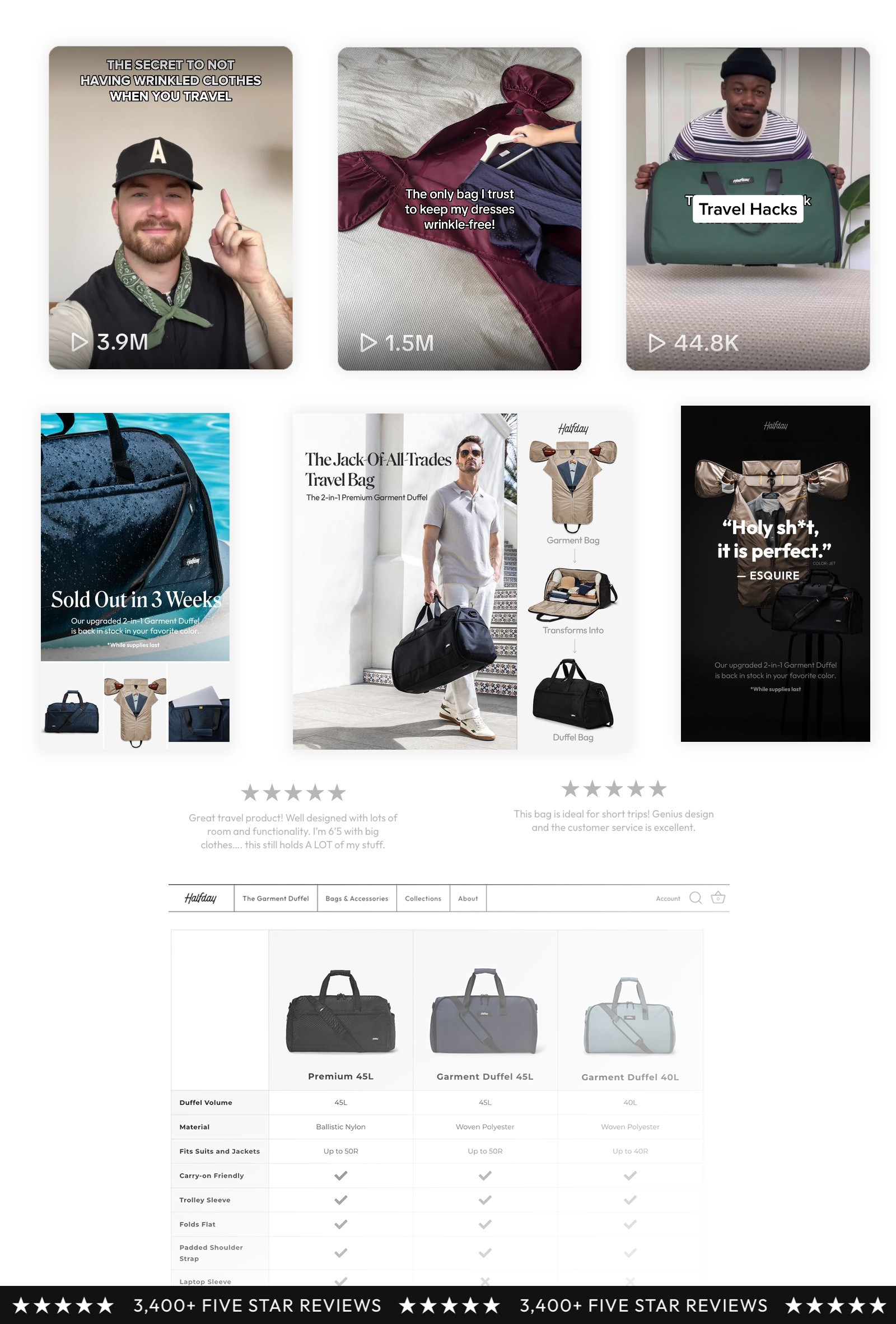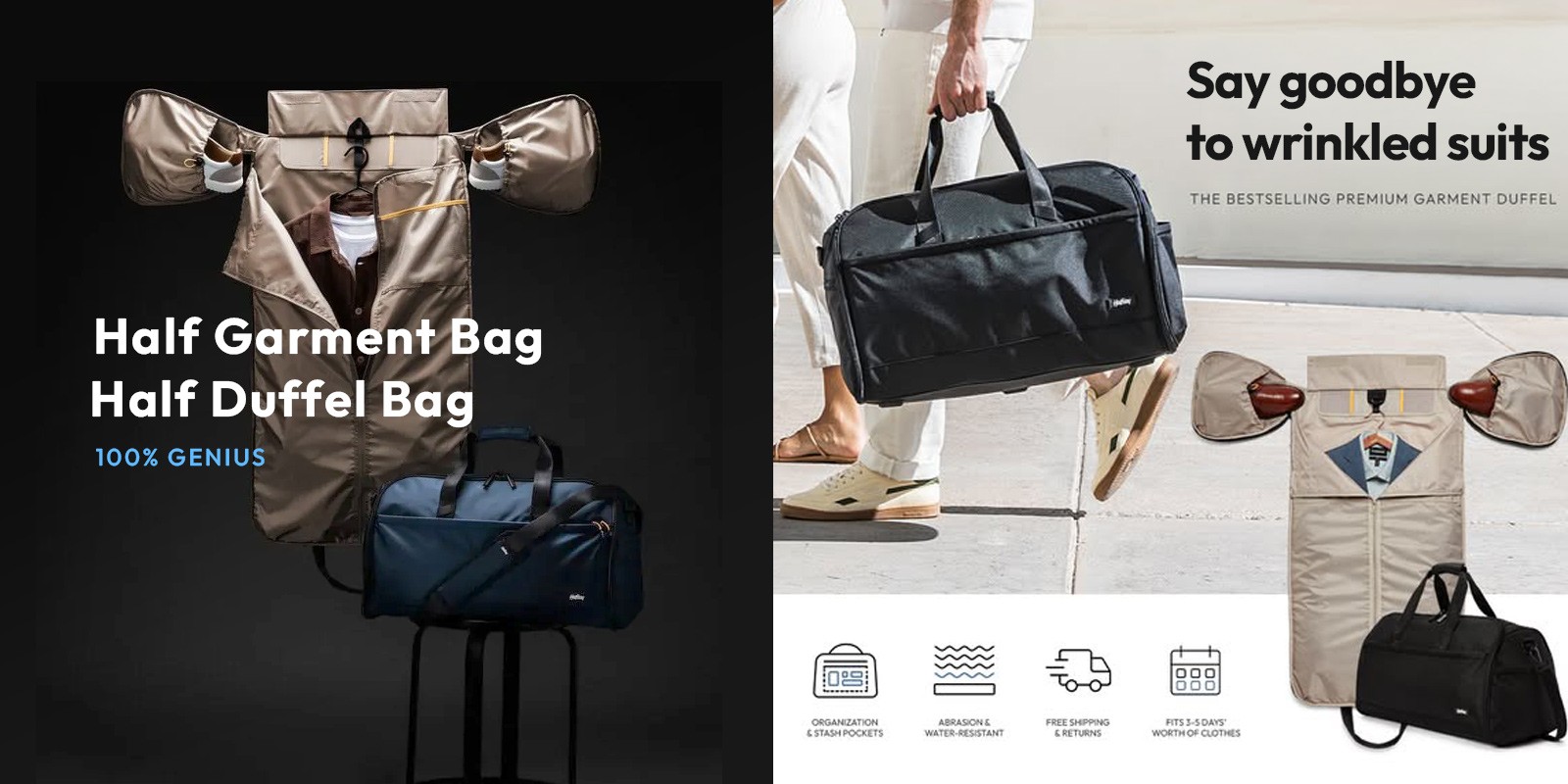 We built the brand around our hero product—a 2-in-1 garment duffel designed to simplify travel and eliminate wrinkles. That idea of packing smarter for long weekend trips became the foundation for our identity and marketing. • Developed messaging framework rooted in product innovation • Positioned brand in travel lifestyle vs. commodity luggage