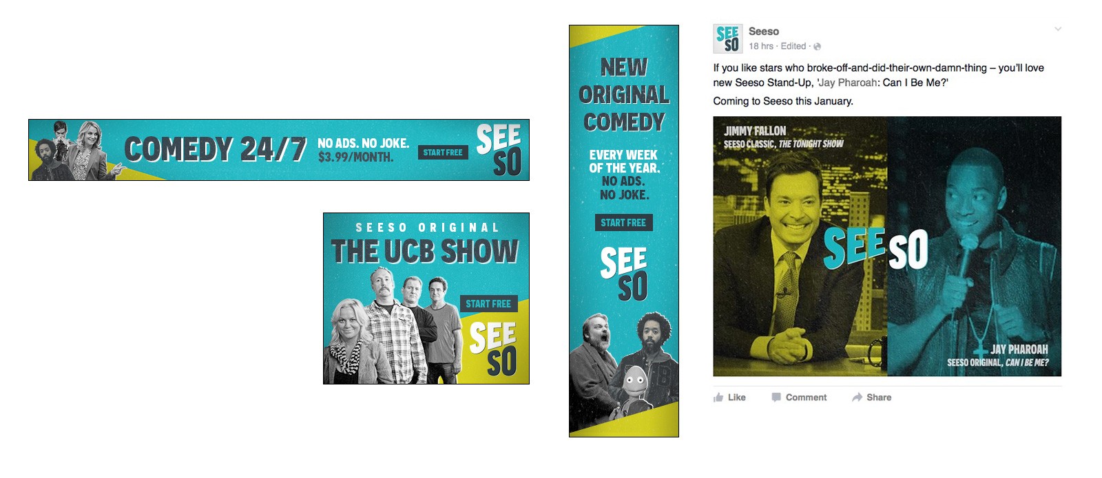We positioned Seeso as your funny friend who's always got the perfect reco, from obscure comedy classics to weird up-and-coming comedy acts. The brand's look-and-feel was left intentionally unpolished, much like browsing records in a funky vintage shop.
